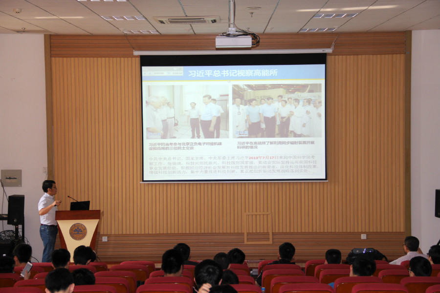 紧接着进行高能所科技前沿讲座。张源老要介绍了关于国内外粒子加速器的发展情况及差距,并解释了北京的粒子对撞机的工作原理以及粒子加速的相关知识。何苗的研究领域为中微子物理和中微子探测技术,他给同学们介绍了中微子振荡等相关知识。作为大亚湾物理分析团队核心成员和团队负责人,他还讲述了此前在大亚湾项目的工作经历和科研情况,让同学们切实感受到了前沿科研。章志明他主要从事核成像探测器技术研究及探测器研制、核成像技术研究及核成像系统研制、核辐射成像系统、辐射测量仪等成果的转化和产业化工作。重点介绍了核成像相关原理,以及高能所在此方面的技术成就。讲座的最后,三位老师耐心解答同学们提出的问题,并表示十分欢迎同学们的加入。相信通过这次的讲座,同学们对中科院高能所有了更清晰的认识,对自己的未来有了更清楚的规划。