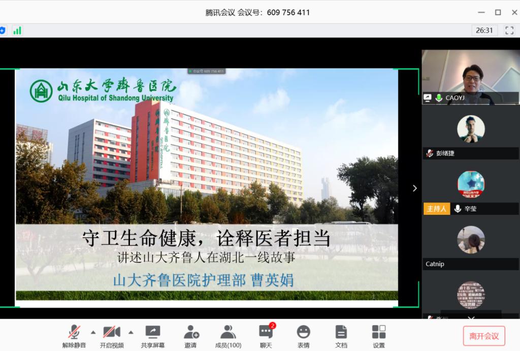 交流中,曹英娟主任结合自身赴鄂援助经历,以“行前”、“在武汉”,以及“归来”这三个时间节点,分享了自己与131名医护人员的抗“疫”路程。行前,剪发、告别、宣誓,每一名医护人员心中除却对未来的担忧,更是坚定的怀揣着“坚守初心,不辱使命,齐鲁精神,敢打必胜”的信念。舍小家为大家,毅然决然奔赴武汉。曹英娟回忆道:“临行前,或许不能算作军令状,但我自己心里已经想好了,这131位队员,不可以出现感染之类的状况。如果有万一,我一定是最后一个离开的。”字字无华,却重若千钧。随后,曹英娟讲述了在疫情一线奋战的点点滴滴。雾化吸入器的改进与医疗器械的细致分离是对患者安全与生命的最高敬畏,《雾霭消逝霁云终临——给武汉病友的一封信》是医者对病友们的贴心关怀,爱心书屋的创办更是如同春雨润物般无声地安抚着每一颗焦虑不安的心......。2月6日至4月6日,两个月的时间,曹英娟及整个赴鄂医疗队用自己的实际行动彰显了深藏于心不言语表的家国情怀。