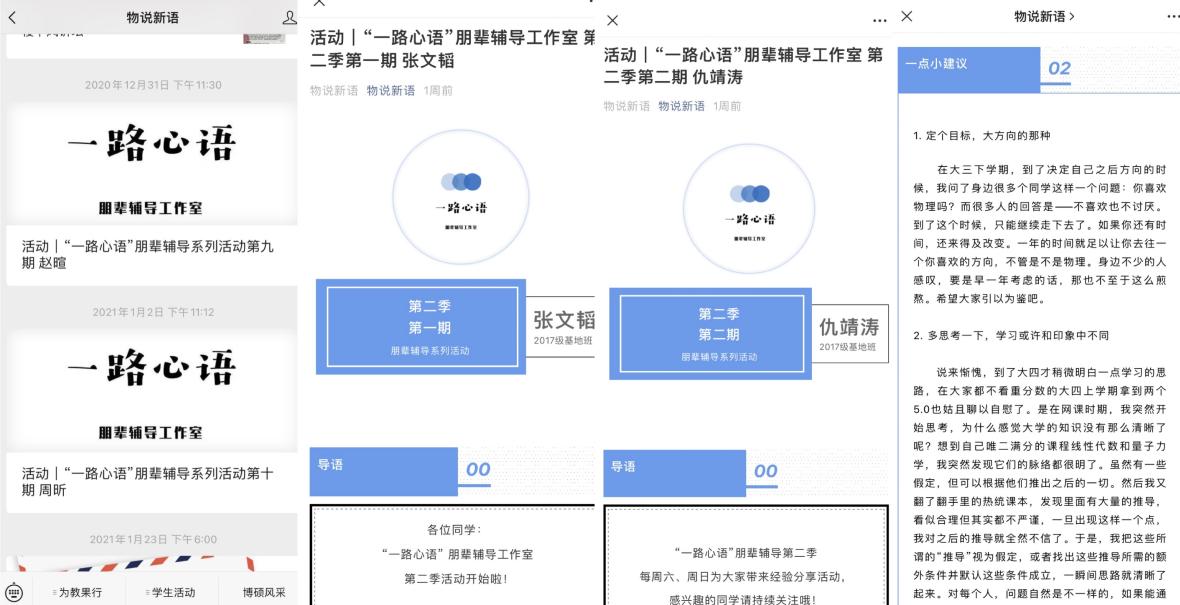 2020年12月,开云app登录入口“一路心语”朋辈辅导工作室首次启用,10期朋辈辅导活动吸引了全院百余人次学生参与,发布学习心得、实习经历、科研经验等相关活动推文十余篇,点击量达2000余人次。新学期开云app登录入口“一路心语”朋辈辅导工作室将继续秉承“以学生发展为中心”的理念,践行“济困、励学、厚德、强能”助学育人体系要求,发挥助教岗位育人作用,促进物院学子学业学习进步和身心健康发展,助力培养“德智体美劳”全面发展的物理人。