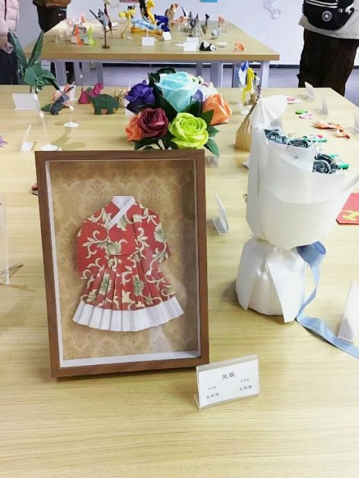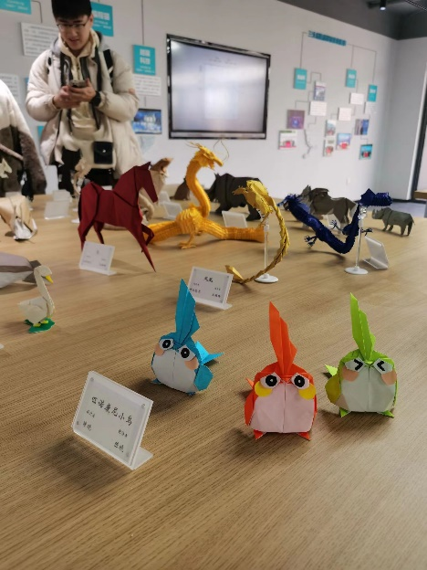 展览共展出一百余件折纸作品,涵盖现代折纸、花球折纸、镶嵌折纸等各种类型,人物、动物、花卉、符号等题材一应俱全。除了晋洁、陈子欣、彭俊翔等社团成员提供的优秀作品外,还有几件由国内著名折纸艺术家设计并折制的作品在展览中亮相:陈晓老师的最新作品“匹诺康尼的折纸小鸟”、孟伟凝老师的代表作“狼”“绿孔雀”……济南折纸艺术家宋佩琦老师也为本次展览提供了数十件作品,其中包括他的代表作“汉服”。