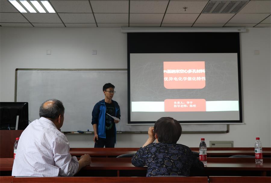 21个团队分别就成员介绍、选题背景、研究内容、预期成果等方面展示了自己的团队和项目,六位评委分别也就其细节提出了诸多关键问题和宝贵建议。首先答辩的是2016级的刘伟杰,这个由四名各具特长的团队选择了研究“量子点敏化太阳能电池Cu2S对电极的改进”,评委对其预期光电转化效率和实验设备提出了一些建议。接下来的“具有荧光特性的有序介孔二氧化硅材料的制备和光谱特性”、“直接反应动力学方法研究Cl+SiH4反应”、“二氧化碲光传感器的制作与性能测试”、“ 基于压电俘能器的可充电‘桌面’” 等令人耳目一新的题目也是使评委提出了许多宝贵的问题。然后15级的程健团队的单片机体感音乐播放系统与手语发音系统引发了评委们就体感传感器的激烈讨论。接下来的“电路方法求解薛定谔方程”、“ 关于Zn-Sn LDH的染料敏化太阳能电池的研究”两个题目更是体现出来同学们的创新能力。16级齐世超团队的“钛酸铋钠-铝钽酸钡的制备与性能研究”项目被评委们指出题目新颖、预期成果踏实可行,得到评委的一致认可。后面的管冬团队提出的VR远程控制实验设备获得了评委的诸多改良建议,刘齐斌的对其“锑锰-锆钛酸铅系压电陶瓷应变记忆效应研究”流畅而又丰富的展示获得了评委一致的认可。