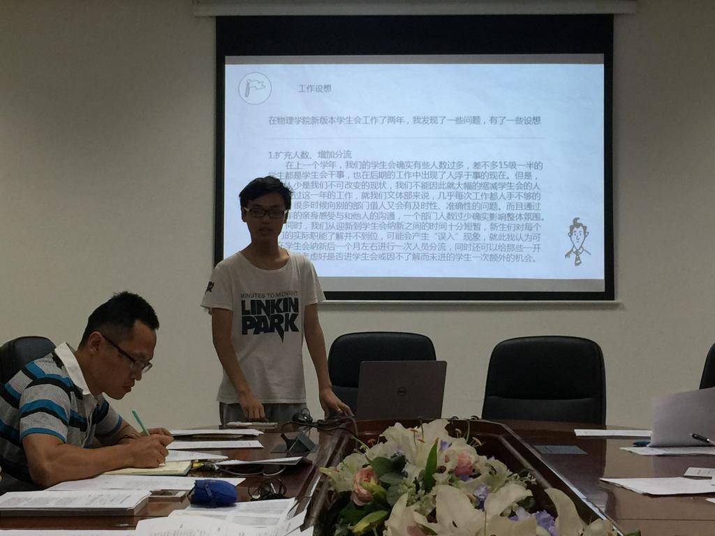 6月13日晚上7点,开云app登录入口2017届学生会竞职答辩会在中心校区知新楼C座7楼会议室举行。开云app登录入口党委副书记吴天柱,辅导员朱强出席本次会议。