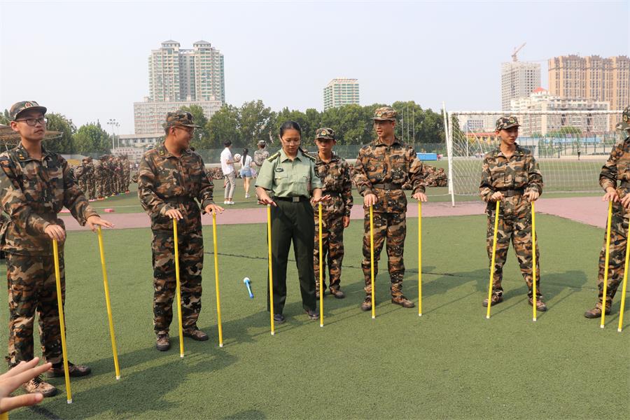 另一部分同学选择“不倒森林”游戏,数名学员两手中拄棍,围成一圈,绕圈走,顺次交换棍子,并保证棍子不倒。在辅导员老师的口号指挥下,游戏顺利开展。虽然刚开始几次,大多数同学都不能成功保证棍子不倒,但是经过几次练习后,游戏就变得非常容易了。随后,学员们开始尝试一次跳过两个棍子,经过几次实验后,居然也十分顺利地完成了。谈及游戏感想,同学们都表示只要稳住,团结一致,就能够轻松实现目标。这和军训时的团结精神正是一致的。
