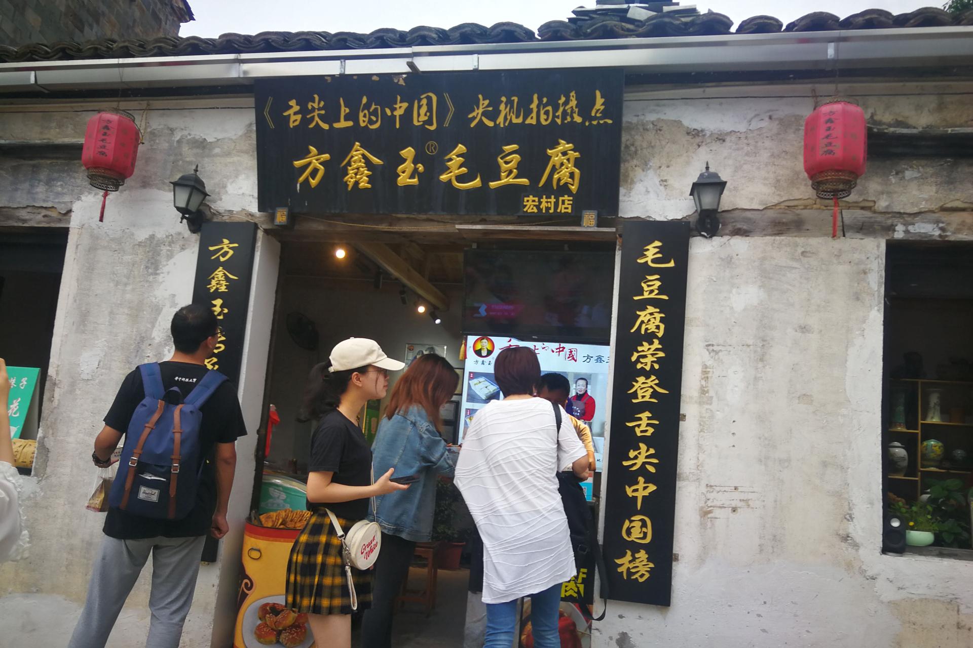 根据当地居民推荐,调研团又来到了宏村中心大树旁方鑫玉毛豆腐店铺。该店铺为《舌尖上的中国》央视拍摄点,店铺里的电视正播放着对于毛豆腐的相关介绍,毛豆腐是通过以人工发酵法,使豆腐表面生长出一层白色茸毛,多通过煎的方式来烹饪,味道鲜美。店主颇为骄傲地向调研团成员展示了胡锦涛先生在走访宏村时留下的影像资料。